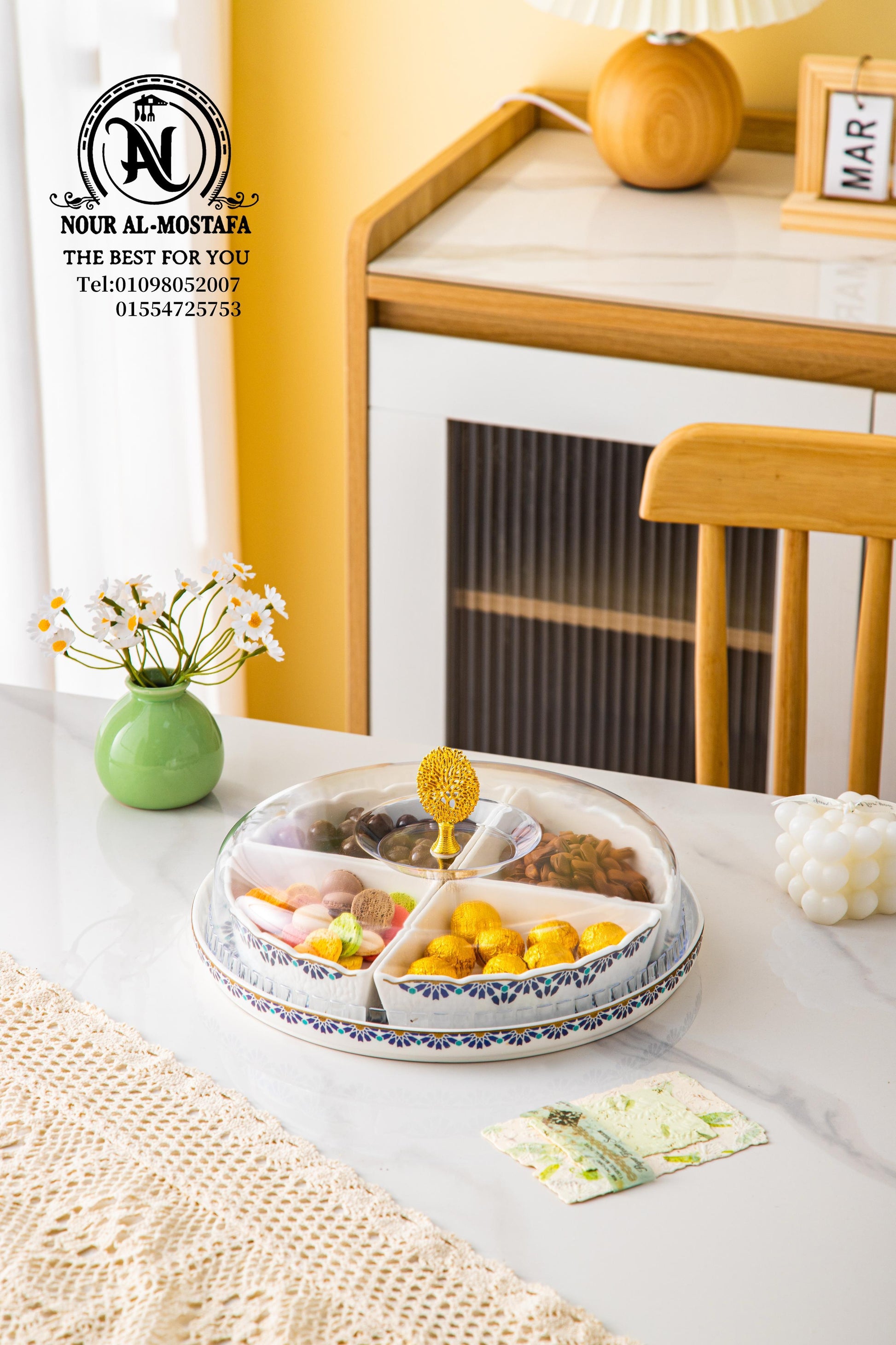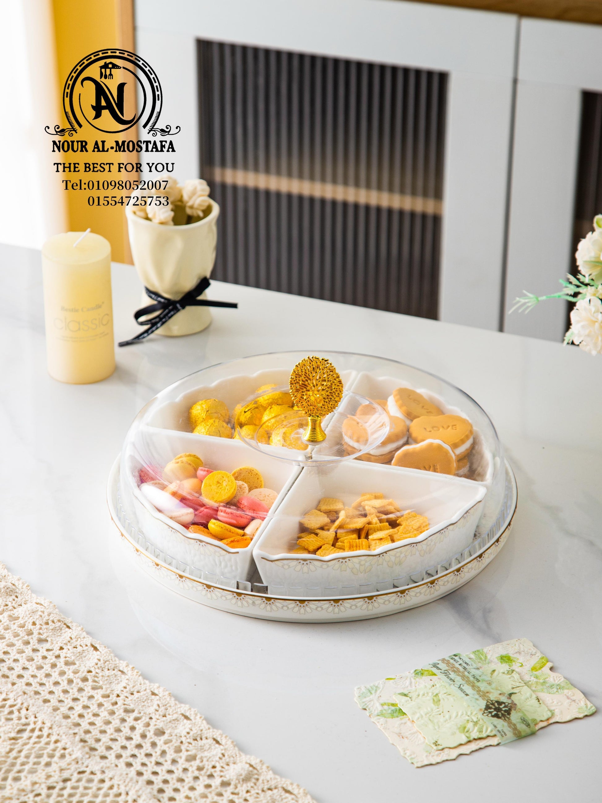 ✔️ طبق تقديم كبير بغطاء زجاج منقوش – مقسم من الداخل، مثالي لتقديم المكسرات والتسالي بشكل أنيق.